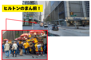 ニューヨーク名物のB級グルメと言ったらハラルガイズ!大人気のフードスタンドがヒルトンの真横にあります!人気メニューのチキンオーバーライスを求めご飯どきには長蛇の列!味は簡単に言うとパラパラのライスにチキンと野菜がバッと乗っていて、シーザードレッシングで味つけたような感じ?(私のボキャブラリーではこの表現が限界)ポンちゃんは大好き。こちらも夜中までやっているので要注意。。。